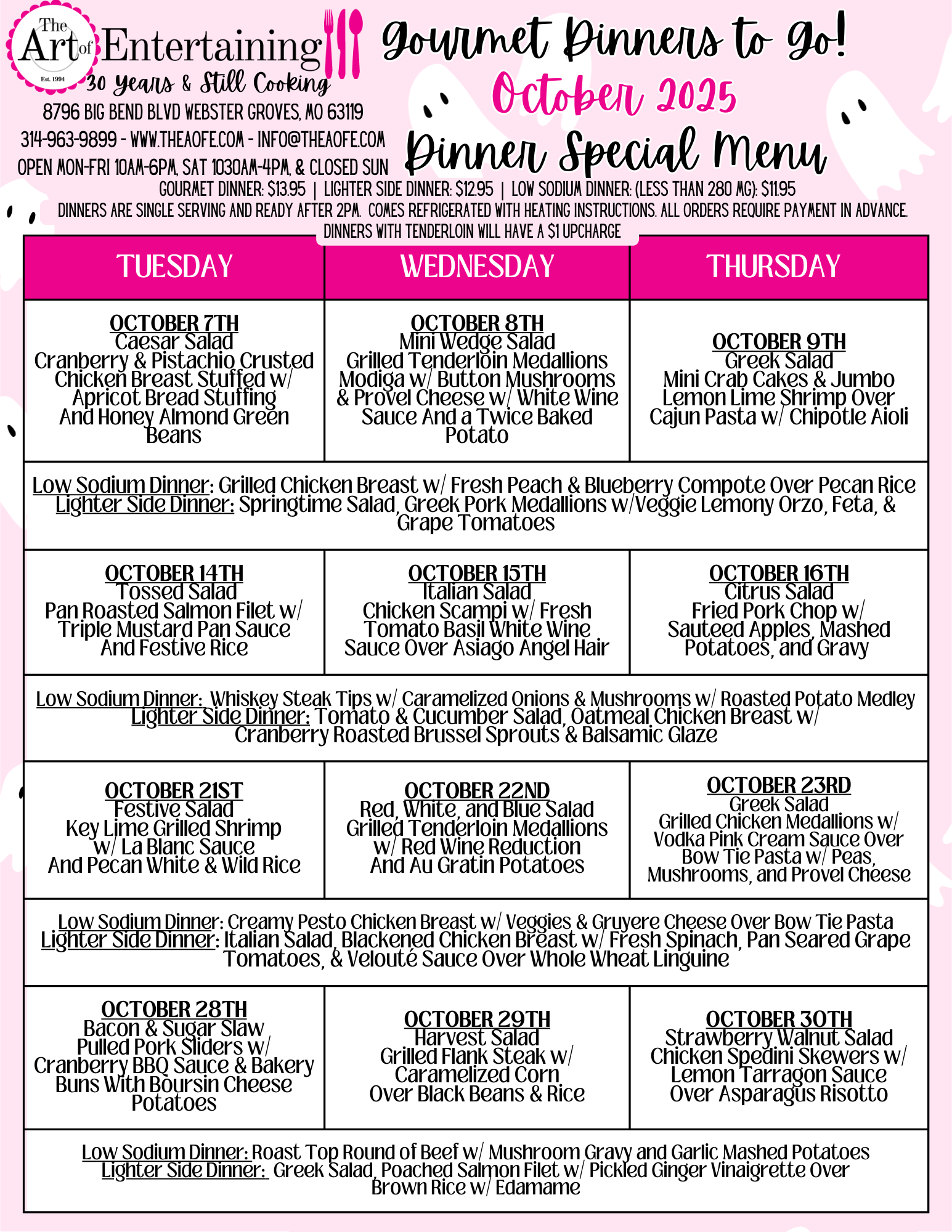 Chicken Parmesan ~ Three Cheese and Meat Lasagna ~ Chicken Tetrazzini ~ Beef Stroganoff ~ Beef Tips Madeira ~ Cannelloni ~ Chicken Diane ~ Chicken Lemon Artichoke w/ Pasta ~ Meatloaf w/ Mashed Potatoes ~ Pasta Con Broccoli (V) ~ Chicken Pasta Con Broccoli ~ Eggplant Boursin Pasta (V) ~ Pasta w/ Meat Sauce ~ Light Apricot Chicken ~ Gluten Free Jambalaya ~ Low Sodium Pork and Veggies